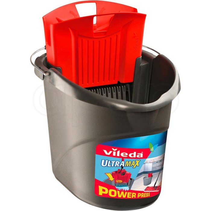 Chromovaná konstrukce na otáčivých kolečkách. Ždímač na mopy, kovový košík.