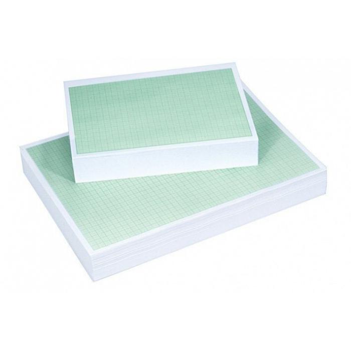Bezdřevý papír. Jednostranný zelený potisk milimetrovým rastrem s dělením po 1,5 a 10mm. Pro zaznamenávání tabulek, grafů, nákresů, k rýsování geometrických tvarů, pro pomocné plánky při rozmístění nábytku v bytech či okrasných rostlin v zahradách.