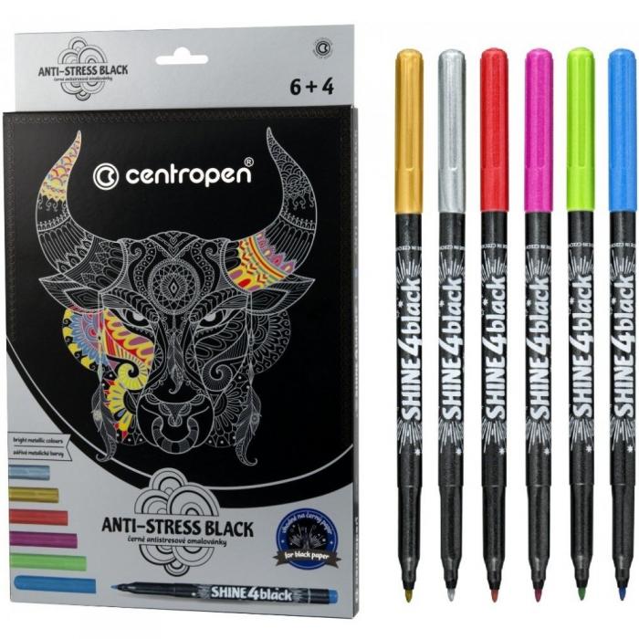 Metalické značkovače, ideální pro vybarvování jemných detailů na tmavý papír antistresových omalovánek. Sytý inkoust.