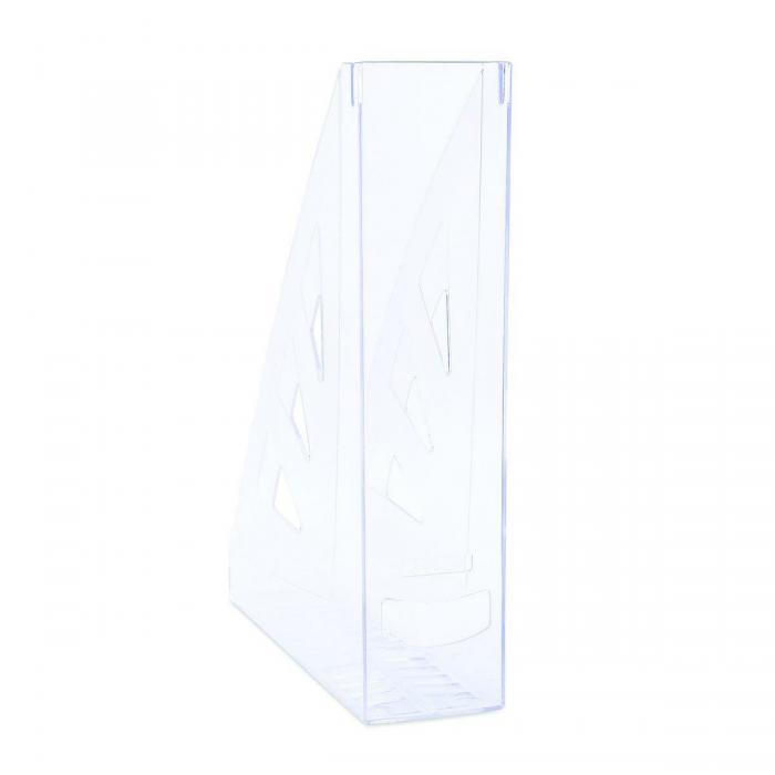 Moderní stojan na časopisy do formátu A4+. Vyroben z pevného kartonu. Přední strana zkosená a s otvorem pro snadnější manipulaci s obsahem.