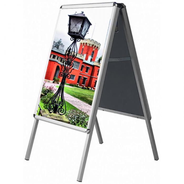 Zákaznický poutač pro interiéry i exteriéry. Stojan z hliníkových profilů. Na obou stranách klaprám profilu 3,2cm. Možnost oblých či ostrých rohů. Integrované otvory odvádějí vodu.