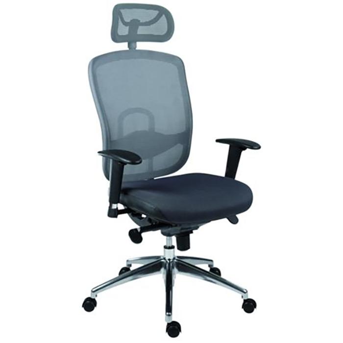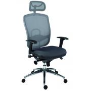 Kancelářská pracovní židle s prodyšným opěrákem a opěrkou hlavy, synchronní mechanismus s nastavením síly protiváhy a několikanásobnou aretací, bederní regulovatelná opěrka. Svisle a vodorovně nastavitelné područky s měkkou dotykovou plochou. Aluminiová leštěná báze, kolečka s gumovou obručí pro všechny typy povrchů.