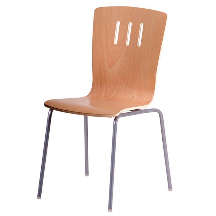 Překližková židle atraktivního designu do jídelen a konferenčních místností. Sedák i opěrák z lakované překližky. Pevná konstrukce s povrchovou úpravou chrom nebo hliník.