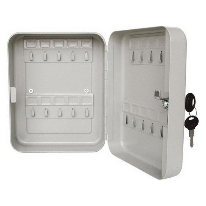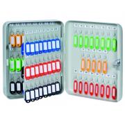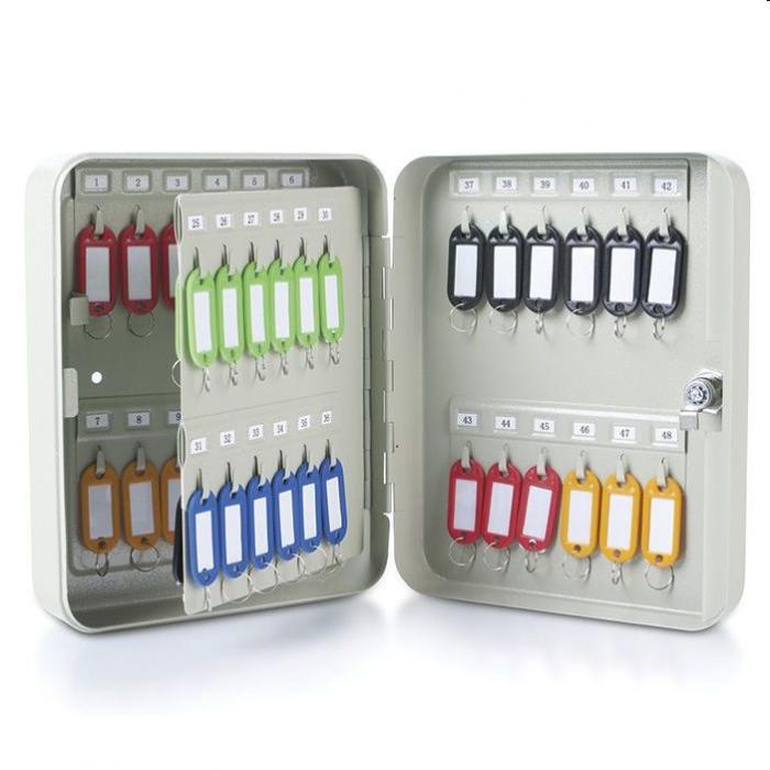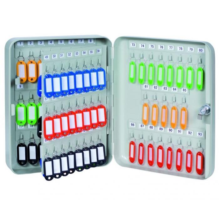 Odolná kovová schránka pro 52 klíčů. Jednotlivá políčka jsou očíslována a dají se barevně odlišit pomocí zvlášť dodávaných jmenovek na klíče.
