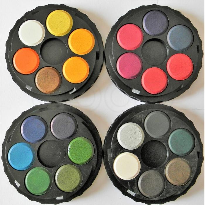 Syté vodové barvy. Vhodné pro speciální výtvarné techniky - kolorování fotografií, malby portrétů, malby na dekorační předměty, zdobení kraslic aj. Plastový barevník s transparentním víčkem. Netoxické.
