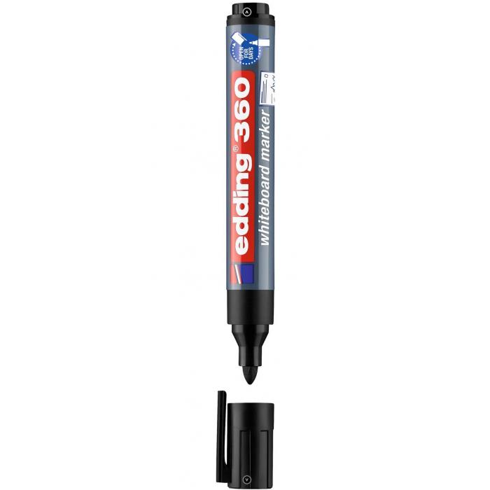 Edding 360. Popisovač na bílé tabule s kulatým hrotem, inkoust se slabým zápachem. Doba cap-off: lze ponechat několik dní bez nasazeného uzávěru, aniž by hrot zaschl. Barva žlutá.